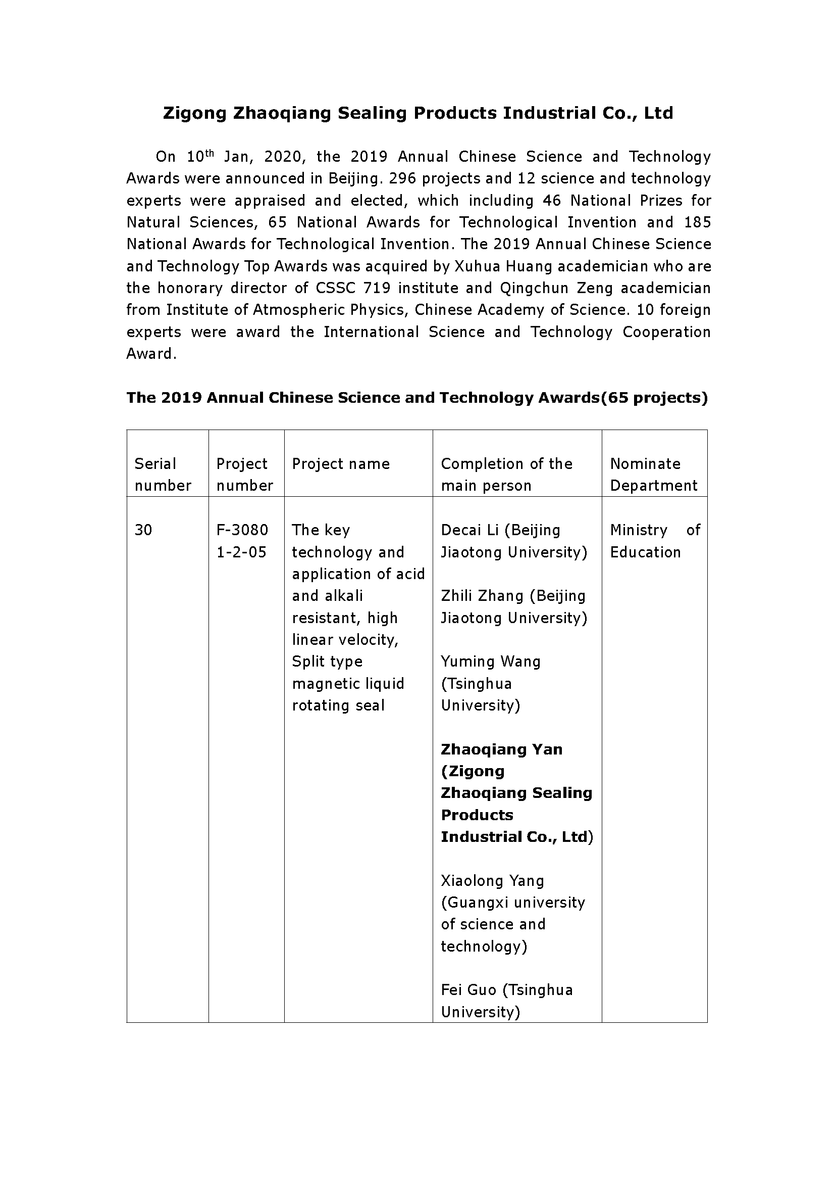 ZIGONG ZHAOQIANG SEALING PRODUCTS INDUSTRY Co., Ltd. won the Second Prize of 2019 National Science and Technology Progress Invention